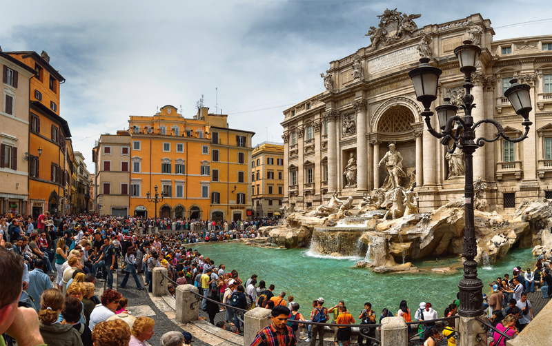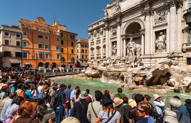 Этого места туристу не миновать. Фонтан Треви — самый большой в Риме. Он построен архитектором Николо Сальви по заказу папы Климента ХІІ. Фоном для фонтана послужил фасад дворца Поли (в нем в начале XIX века жила Зинаида Волконская — «царицей муз и красоты» называл ее А. С. Пушкин). Фонтан огромный, а площадь не рассчитана на толпы туристов со всего света. Тут просторно только Нептуну, который словно выезжает из центральной ниши дворца стоя в раковине, запряженной горячими скакунами. Каждый турист считает своим долгом кинуть в фонтан две монеты: одну — чтобы вернуться, другую — чтобы сбылись желания (фото 5).