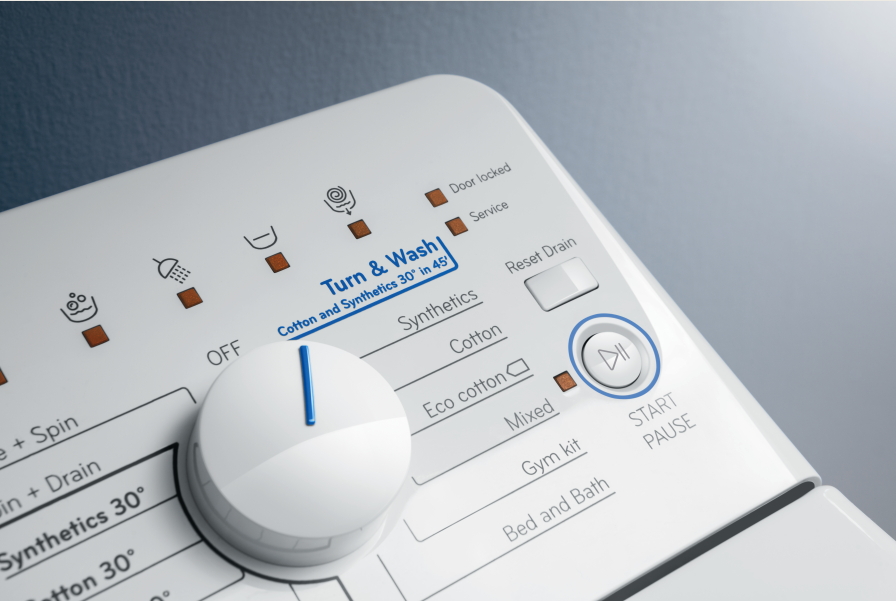 Режим Turn&Wash специально разработан для одновременной стирки вещей из разных материалов. При температуре 30°С стиральная машина очистит от загрязнений как изделия из хлопка, так и синтетики. Длительность цикла при этом составит 45 минут. Можно больше не думать, какой режим выбрать – достаточно повернуть ручку программатора и нажать кнопку «старт».