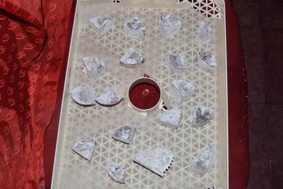 Застывшее желе режем, обсыпаем картофельным крахмалом и укладываем на застеленный пергаментом лоток дегидратора.