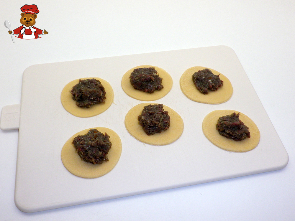 7. Поместите начинку в центр тестовых кружков и сформируйте заготовки для хинкали. Заготовки разложите на верхний и нижний ярусы пароварки.