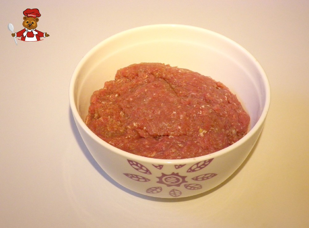1. Порежьте репчатый лук и говядину на кусочки, которые свободно пройдут через загрузочное отверстие мясорубки.