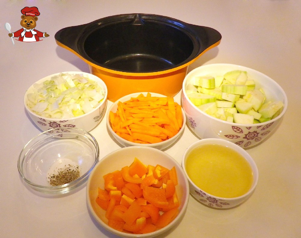 4. Порежьте овощи мелко и обжарьте их на подсолнечном масле, посолите, поперчите, остудите их до комнатной температуры и пропустите через мясорубку с крупной решёткой.