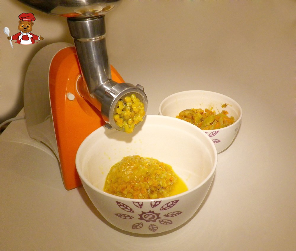 6. Установите на мясорубку насадку для тонких колбасок, поместите в загрузочную воронку овощную начинку и начините ей заготовки для кеббе.