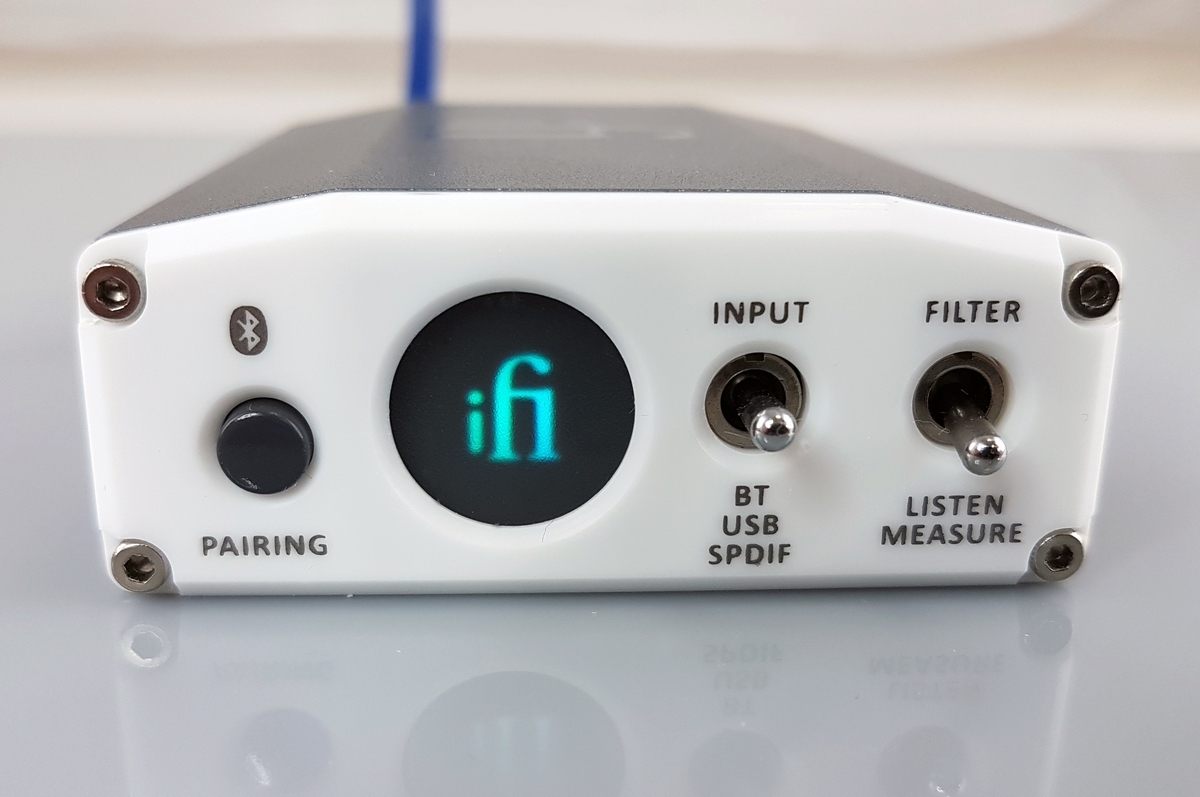 Есть тут еще два тумблера: для переключения между цифровыми входами (BT, USB, SPDIF) и переключения между двумя цифровыми фильтрами (Listen, Measure), которые меняют характер звучания, но не глобально: Listen звучит более плотно и капельку шире, а Measure - более линейно и утонченно. В общем, разница едва уловима и различима в мелких нюансах.