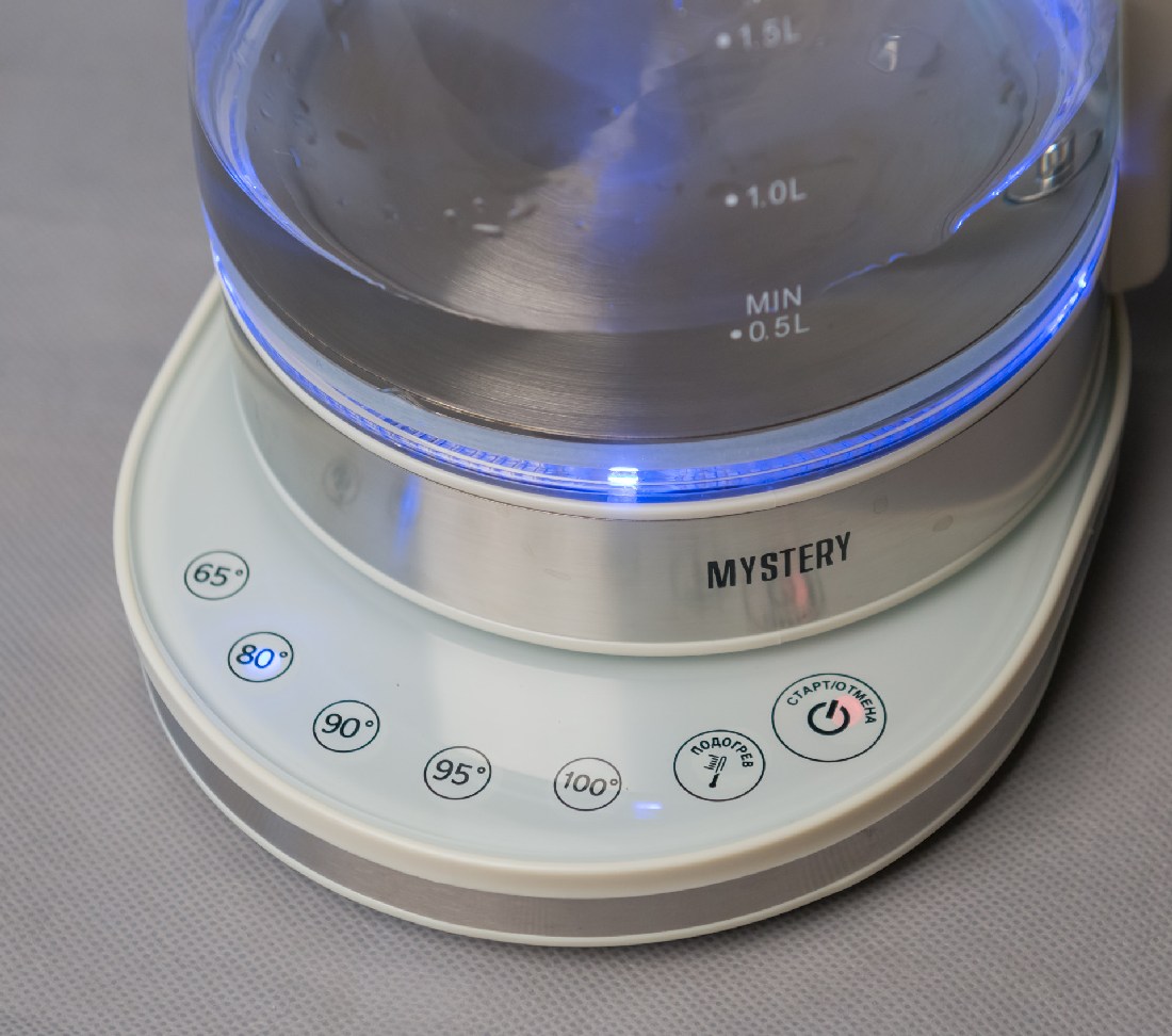 Кипячение или нагрев включается с помощью двух сенсоров-кнопок: Температура и Старт. При нажатии на температуру начинает мигать индикация этой кнопки, после начала нагрева индикация горит постоянно. После закипания воды чайник автоматически отключается, при этом тихо звучит трехкратный сигнал. Подсветка кнопки Температура не горит. А подсветка кнопки Старт продолжает мигать. Через 1 минуту все подсветки на панели управления гаснут.