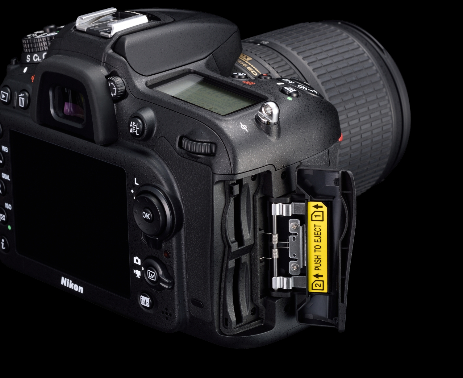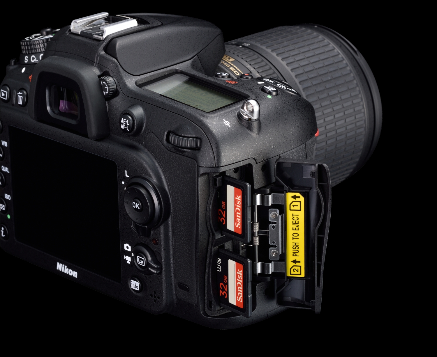 Для записи фотоснимков и видеороликов в D7200 используются карты формата SD (поддерживаются новые модели SDXC и UHS-I). Камера оборудована двумя слотами, которые можно настроить несколькими способами. Для исключения ситуации, когда в неподходящий момент закончилось свободное место, можно выбрать запись на вторую карту после заполнения первой. Для случаев, когда планируется снять не так много кадров, но очень важно их не потерять, предлагается вариант резервирования — параллельной записи на обе карты. Если же сразу после съемки нужно передать кому-то результаты (например, заказчику) пригодится вариант записи на одну карту JPG-версий снимков, а на другую — RAW-версий.