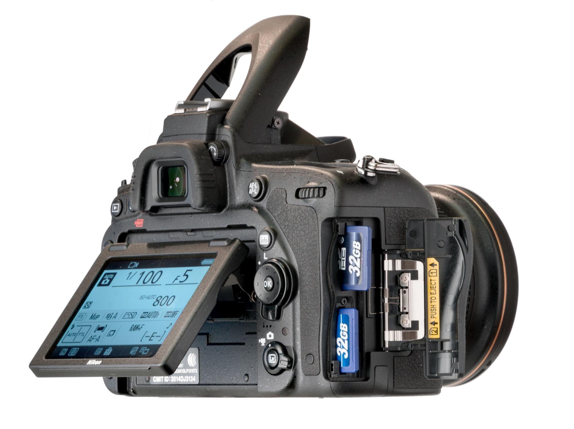 В камере есть два слота для карточек формата SD. Их можно настроить таким образом, чтобы запись во время съемки не прерывалась при заполнении одной из карточек, или чтобы происходила автоматическая сортировка по форматам, например маленький JPG записывается на первую карту, большой RAW для творческого редактирования на вторую.