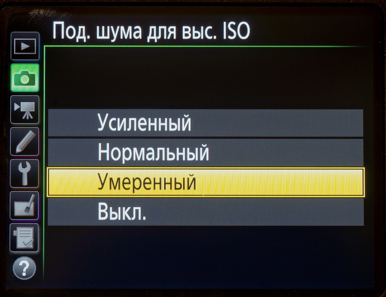 Степень воздействия встроенного подавителя шумов можно регулировать. Слишком сильное подавление шумов приводит к сильной потере деталей, так называемой “пластиковой” картинке. Поэтому рекомендую установить значение подавителя шумов ISO в положение LOW, так мы сохраним мелкие детали, волосы, ресницы, ветки деревьев и фактуру ткани. Подавление шумов длительной выдержки следует отключить, если вы не занимаетесь съемкой звездного неба.