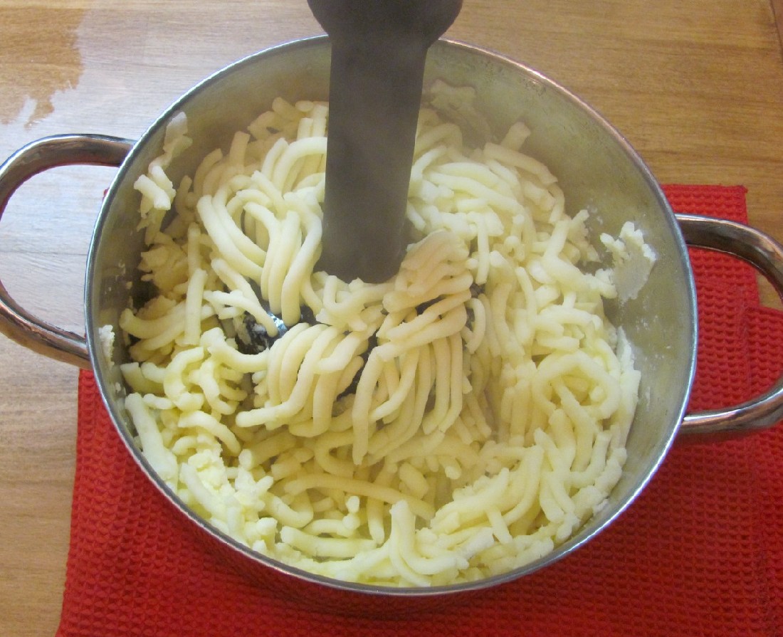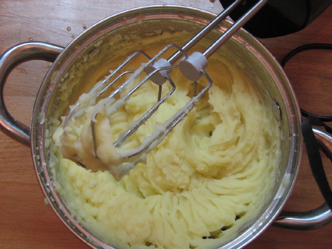 Это насадки из основного комплекта, два вместо привычного одного. Переходник для венчиков имеет два отверстия, совсем как миксер. Зачем два венчика, а не один? Для взбивания более тяжелых смесей, теста для бисквита, картофельного пюре. Мы попробуем приготовить легкое воздушное картофельное пюре. Первое впечатление: блендер удобнее миксера, сам девайс не такой громоздкий, шумит не так громко и работает лихо. Картошку мы сперва размяли толкушкой, потом стали работать миксером, выровняли массу и стали добавлять горячее молоко и масло. Результат на фото — пышное, нежное пюре, причем быстрее и как-то экономичнее по трудозатратам, чем при использовании миксера.