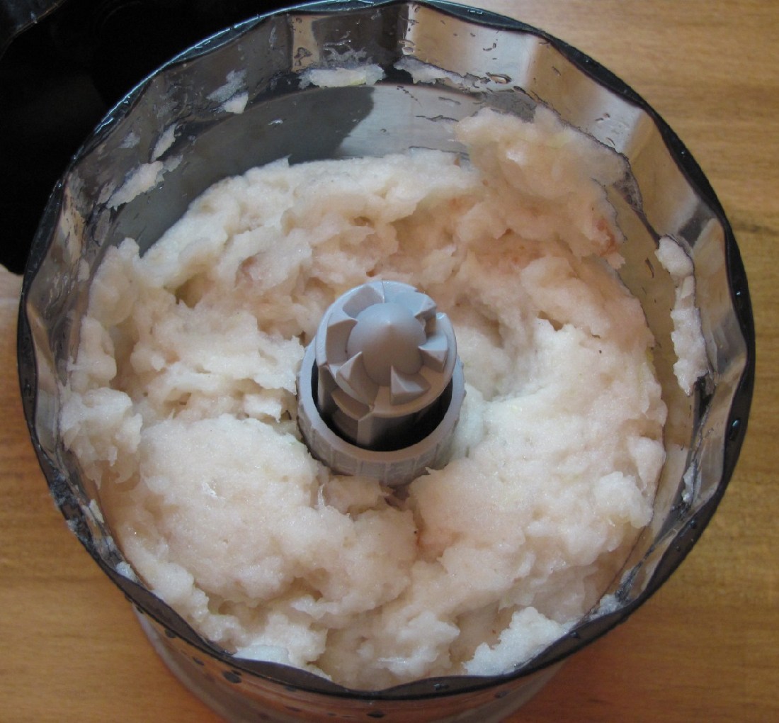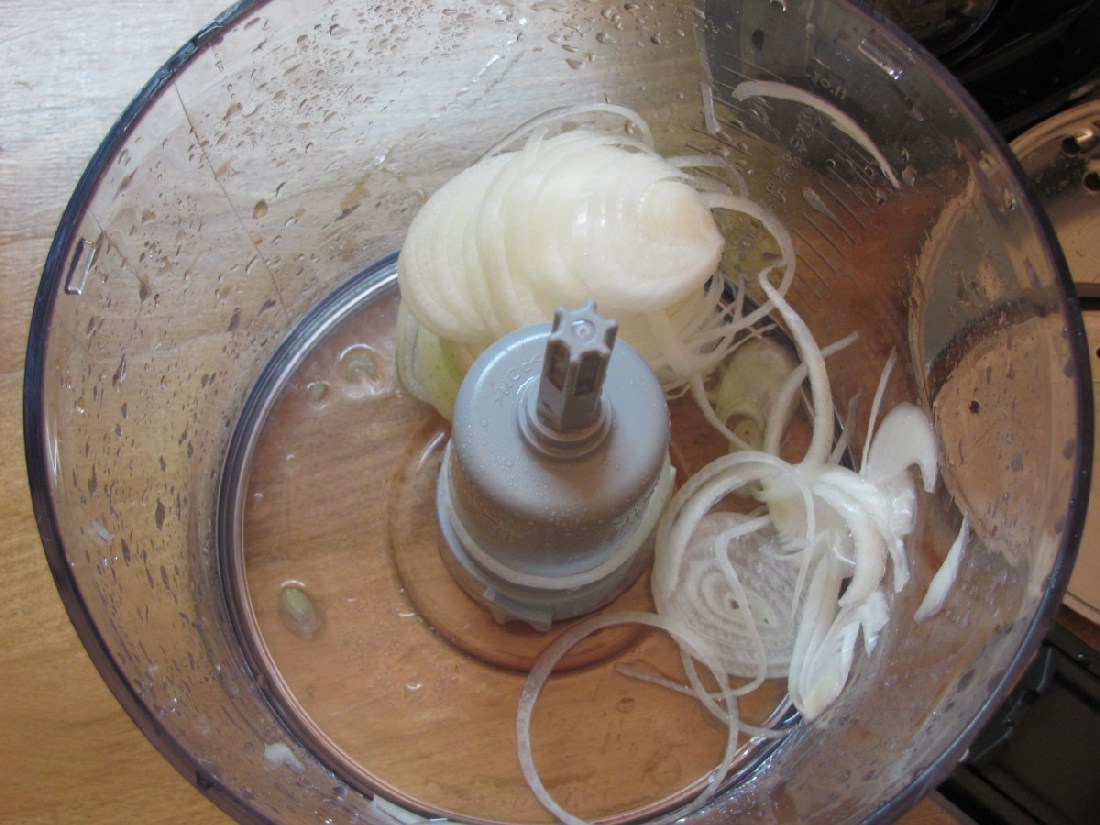 Терка мини-комбайна имеет две рабочих плоскости. С одной стороны — средняя терка для овощей с отверстиями 5 мм. С другой — ломтерезка с высотой ножа порядка 2 миллиметров. При помощи терки мы измельчили морковку очень быстро и красиво. Ломтики на салатик или поджарку. Обрезочек — минимальный. Ломтерезкой порезали лук. Причем удалось порезать его целиком, посмотрите на фото — кольца «стоят» столбиком, они почти не раскиданы по чаше. Согласитесь, это говорит о многом, прежде всего, о качестве лезвия и скорости работы. Благодаря тому, что терка надевается на стержень сверху, нет никаких уголков, где собираются отходы. Крышка чаши изнутри сделана так, что собираться отходам там тоже негде.