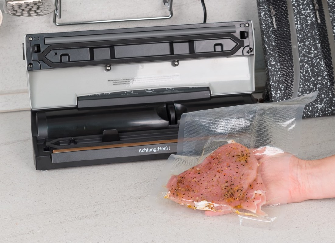 В общем-то, тест прошел так же, как и с моделью CASO VC100, здесь тоже нет режима для влажных продуктов. Трудности те же: надо ухитриться правильно положить стейк в пакет, чтобы не намочить его края в том месте, где будет запаивание. Возможно, мясо удобнее упаковывать в пленку. Пакеты тоже очень плотные, тоже рекомендованы для приготовления в них по технологии су вид. Скорость откачивания меньше, но на качество упаковывания стейков, как нам кажется, это не повлияло.