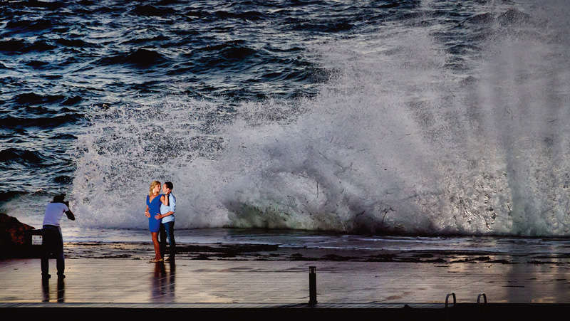 Я наблюдал за работой фотографа издалека. Солнце садилось справа и красиво подсвечивало брызги. Люди воспринимались как силуэты. Вспышку коллеги я поймал совершенно случайно. Зато теперь хорошо видно, как решается на пляже проблема освещения.