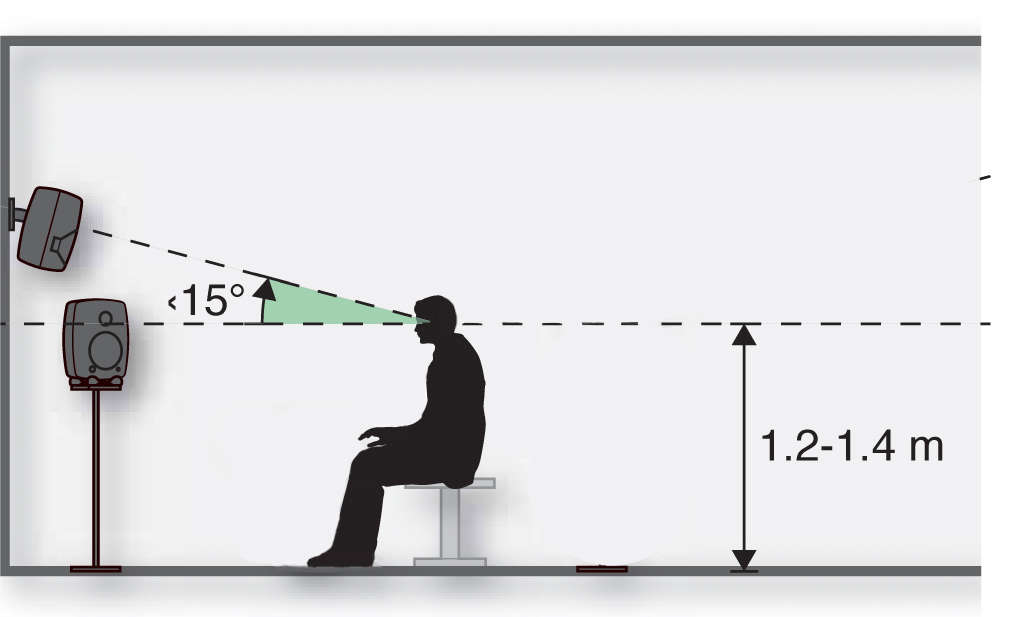 Как правильно, у студийных мониторов и бытовых колонок угол раскрыва в вертикальной площади намного уже, чем в горизонтальной, и если АС установлены слишком высоко или слишком низко, или повернуты вертикально, слушатель оказывается вне оси излучения, поэтому наилучшее расположение колонок по высоте, - когда ВЧ-твитеры находятся на одном уровне с ушами слушателя. Для сидящего человека высота составляет от одного до полутора метров в зависимости от высоты посадки.