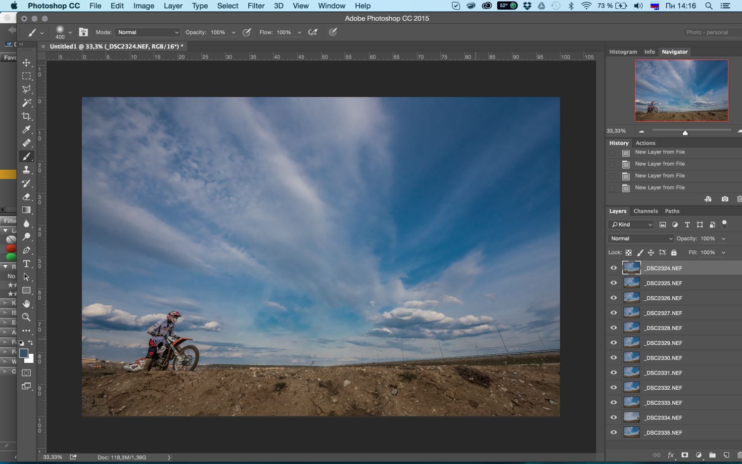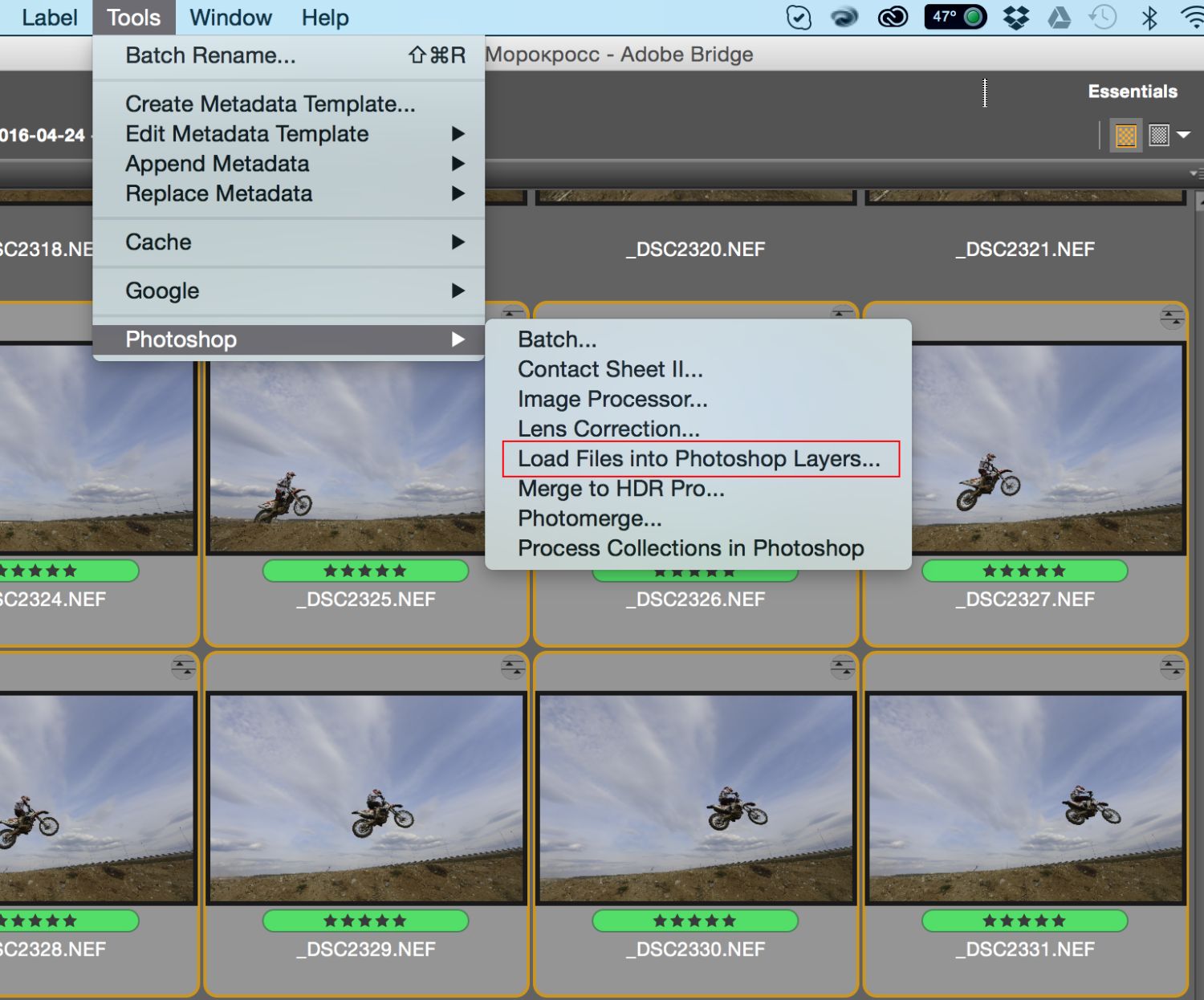 Уже на этом этапе лучше определить, какие фазы движения вам понадобятся для работы, выбрать такие, на которых положения спортсмена не перекрываются. Выбранные файлы можно выделить и загрузить в Photoshop как слои одного файла (в Adobe Bridge меню Tools - Photoshop - Load files as Photoshop Layers). Как только все слои прогрузятся, можно приступать к обработке.