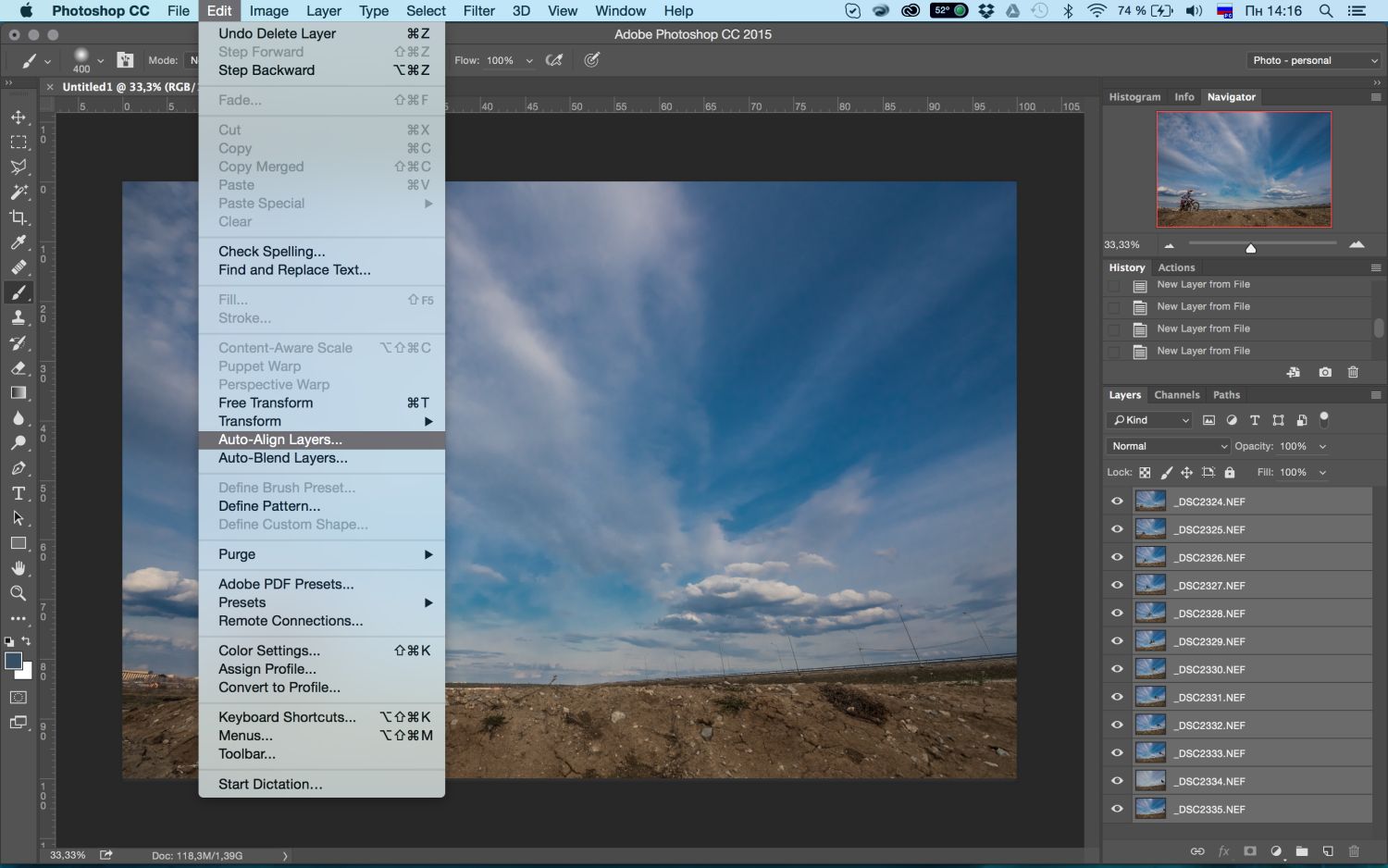 Для начала выберите все слои, идите в меню Edit - Auto-Align Layes и выберите автоматический режим выравнивания. Если во время съемки вы с камерой двигались только незначительно, то программа не внесет существенных изменений в фотографии. Если же вы все-таки «провели» своего героя во время съемки, то будьте готовы к неожиданному результату – программа может существенно исковеркать слои.
