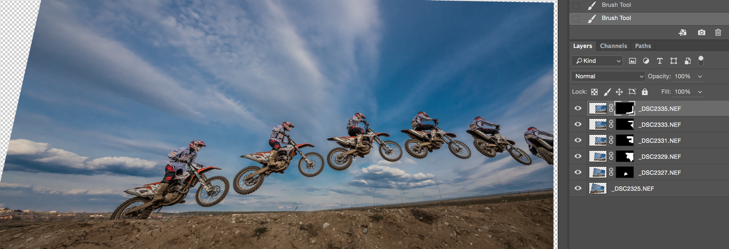 В качестве исходного мы выберем самый верхний слой с фотографией начала движения. Со следующего слоя нам понадобится взять только мотоциклиста. Поднимите слой со следующей фазой движения над первым и добавьте к нему черную маску. Все содержимое слоя скроется. Дальше мягкой белой кистью со Opacity 100 проведите по маске там, где должен быть мотоциклист. Если во время съемки вы зафиксировали замер экспозиции, а на этапе обработки вносили одинаковые изменения во всей файлы, ваш мотоциклист идеально смонтируется на общей фотографии. Если же у вас имелись незначительные колебания по яркости, то лучше подкорректировать отдельную фотографию кривыми на этапе склейки или в ACR, чтобы избавиться от светлого или темного ореола вокруг спортсмена.