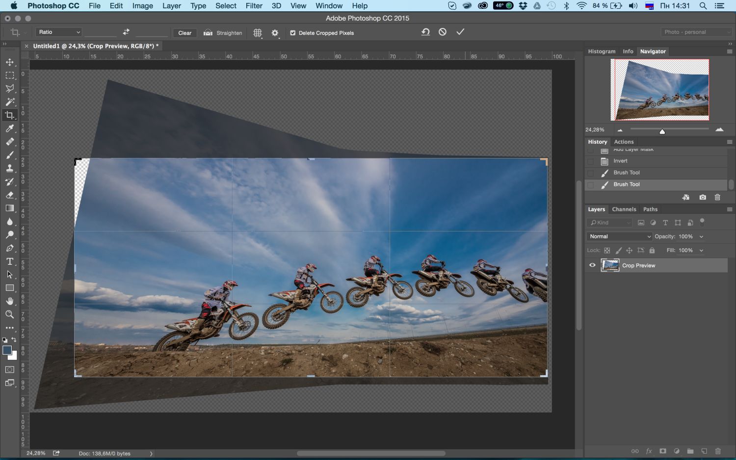 Теперь на нашей фотографии вместо одного мотоциклиста уже два. Последовательно поднимая наверх каждый последующий слой и проявляя на нем при помощи маски только мотоциклиста, мы получим ту самую цепочку движения, эффект раскадровки. Дальше остается только обрезать итоговое изображение, чтобы избавиться от ненужных полей по краям кадра. Снимок готов!