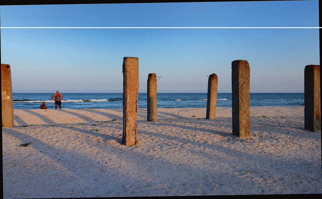 А пока я вижу некоторые технические недочеты. Линия горизонта всего на один градус перекосилась, а глаз это сразу же приметил. Небо пришлось притемнить, тени от свай тоже. Я для этого увеличил контрастность в нижней половине фотографии. Кадрирования верхней части неба можно было бы избежать, если бы во время съемки Вы опустили камеру ниже, чем на этом дубле. Сваи наползли бы на небо еще немного и соединили верхнюю и нижнюю половинки композиции неразрывными брачными узами.