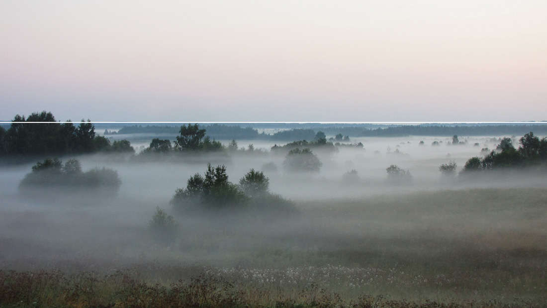 Еще одна хорошая пейзажная работа Евгения Меркушкина, сделанная тем же компактным фотоаппаратом. Но в отличие от пейзажа с морским закатом, здесь тщательная детализация совсем не обязательна. Я бы даже предпочел увидеть больше размытости изображения в глубине композиции, чтобы подчеркнуть тональную перспективу и туманность. К сожалению, суперзумы компактов не способны разделять планы с использованием зон нерезкости. Камеры с маленькими матрицами от рождения наделены большой глубиной резкости. Утренние и вечерние стелющиеся по земле туманы — замечательный объект для съемки «воздуха». Обычно фотографы, дорабатывая картинки, следуют привычному правилу: передний план должен выглядеть контрастнее и резче заднего, потому что он ближе к наблюдателю и воздух меньше размывает предметы на переднем плане, чем удаленные от него.