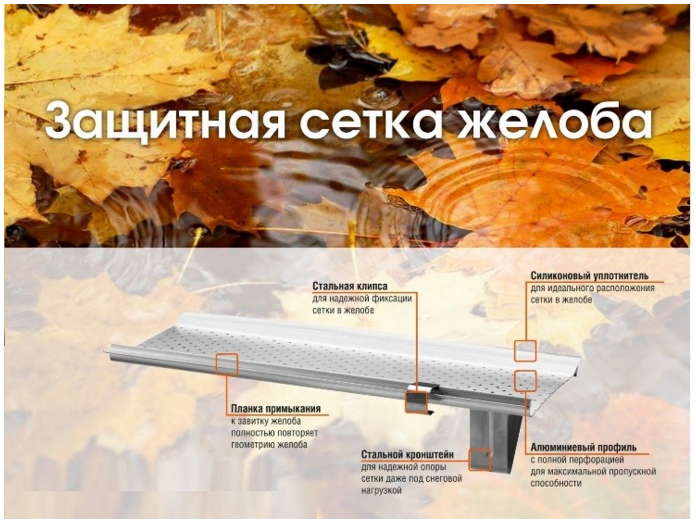 Значительно облегчит задачу установка специальных сеток для водосточной воронки или желоба, которые позволяют пропускать воду и задерживать листву и прочий мусор от попадания в трубы.