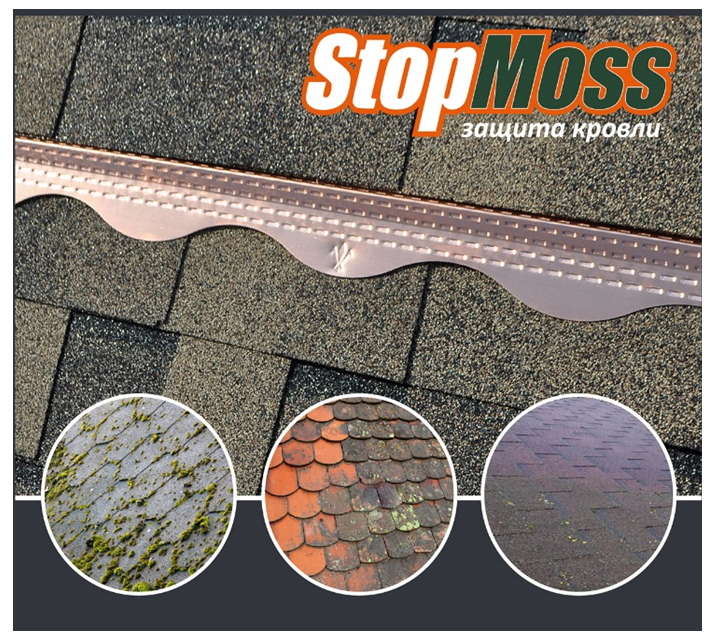 Оригинальное решение предложили в компании AQUASYSTEM: коньковая планка StopMOSS из чистой меди, выполняющая одновременно декоративную и антисептическую функции. Благодаря своему расположению и особой форме она эффективно воздействует на стекающую по скату дождевую воду, насыщая её ионами меди. Таким образом, в течение всего срока эксплуатации гибкой черепицы планка надёжно предохраняет её от появления мха, плесени и лишайников. Одновременно она является оригинальным дизайнерским элементом и украшает кровлю.