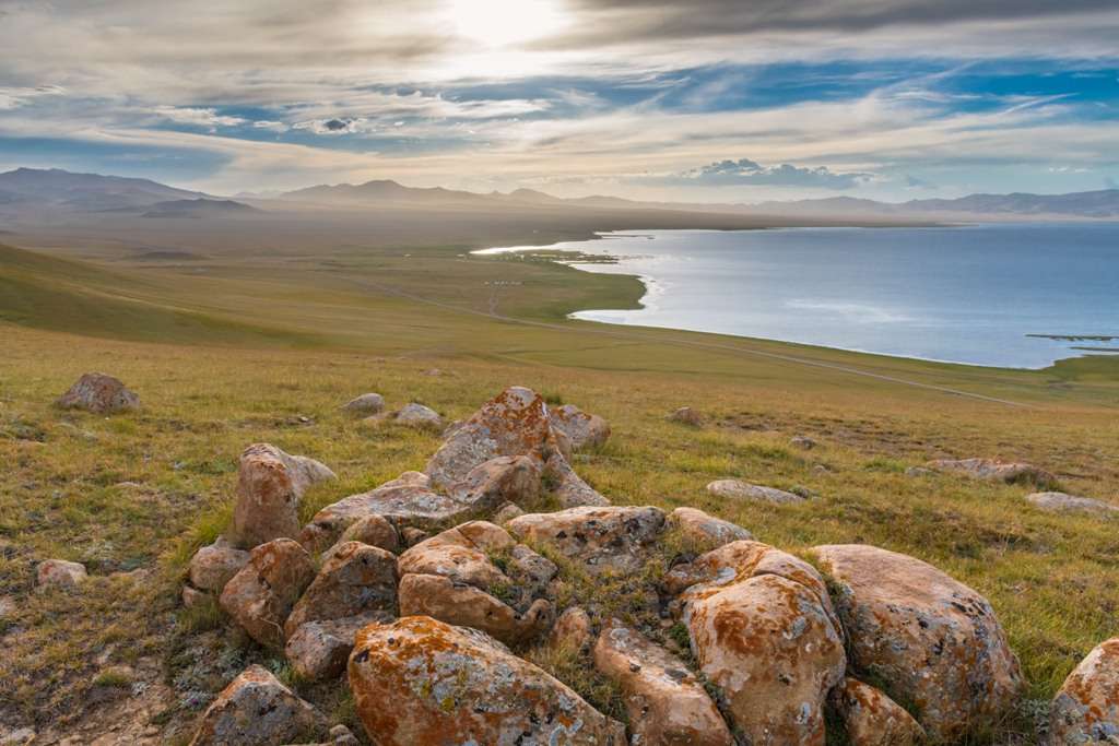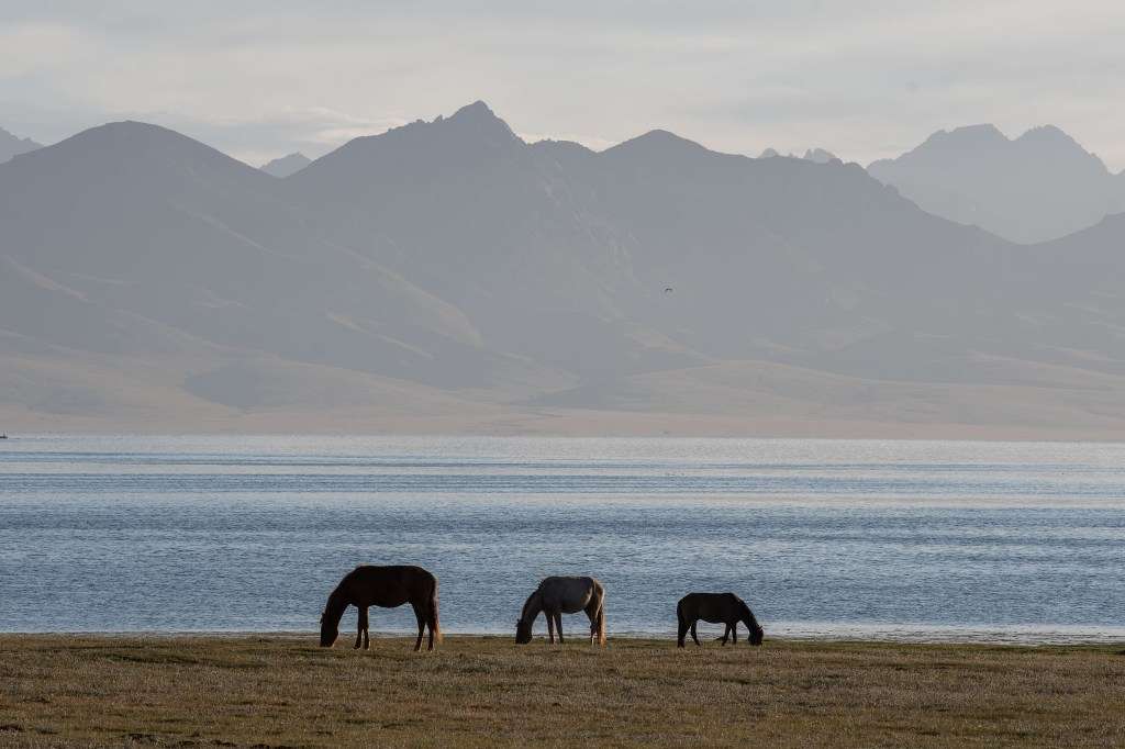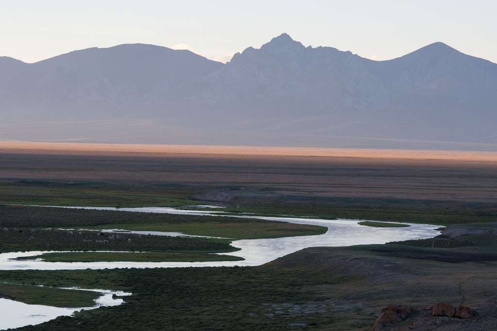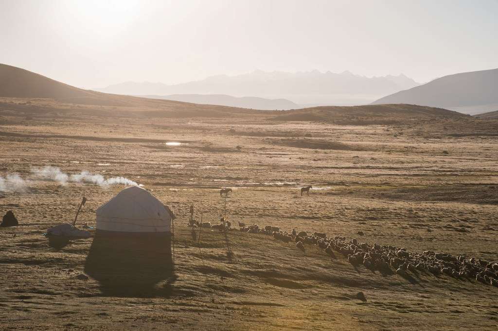 Светлые юрты явно выделяются на темном фоне, а подсвеченные рассветным светом горы и их отражение являются естественной рамкой
