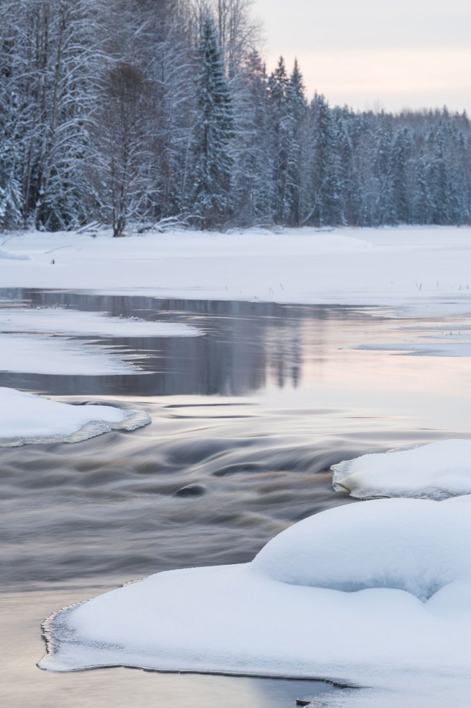 Серия кадров, загруженная в AdobeBridge, а также первый и последний кадры серии. Посмотрите, насколько сильно различается зона резкости на этих фотографиях. На первой в фокус попали только льдинки на переднем плане, но лес ушел в зону размытия. На второй - наоборот