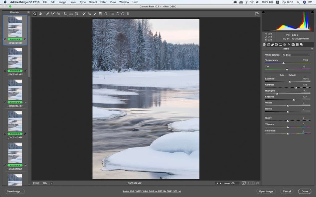 Для начала загрузим все кадры в Lightroomили Adobe Camera RAW. Я покажу весь процесс обработке на примере последнего. Впрочем, движки у этих программ одинаковые, так что вы можете использовать эту технологию и для работы в Lightroom. Открываем все кадры серии и ACR, выделяем их все и обрабатываем по своему вкусу. Нам очень важно, чтобы все кадры серии были совершенно одинаковыми с точки зрения обработки.