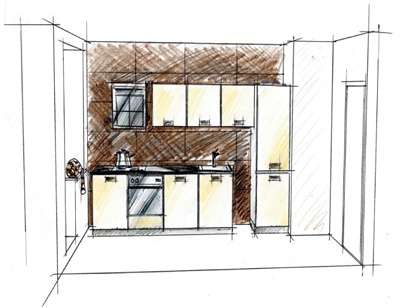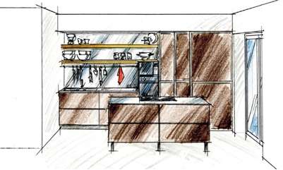 Другая стена практически не занята, потому что для свободного открывания шкафов необходим незагроможденный участок, и там предусмотрено место под вытяжку. С обеих строн от вытяжки можно повесить полки.