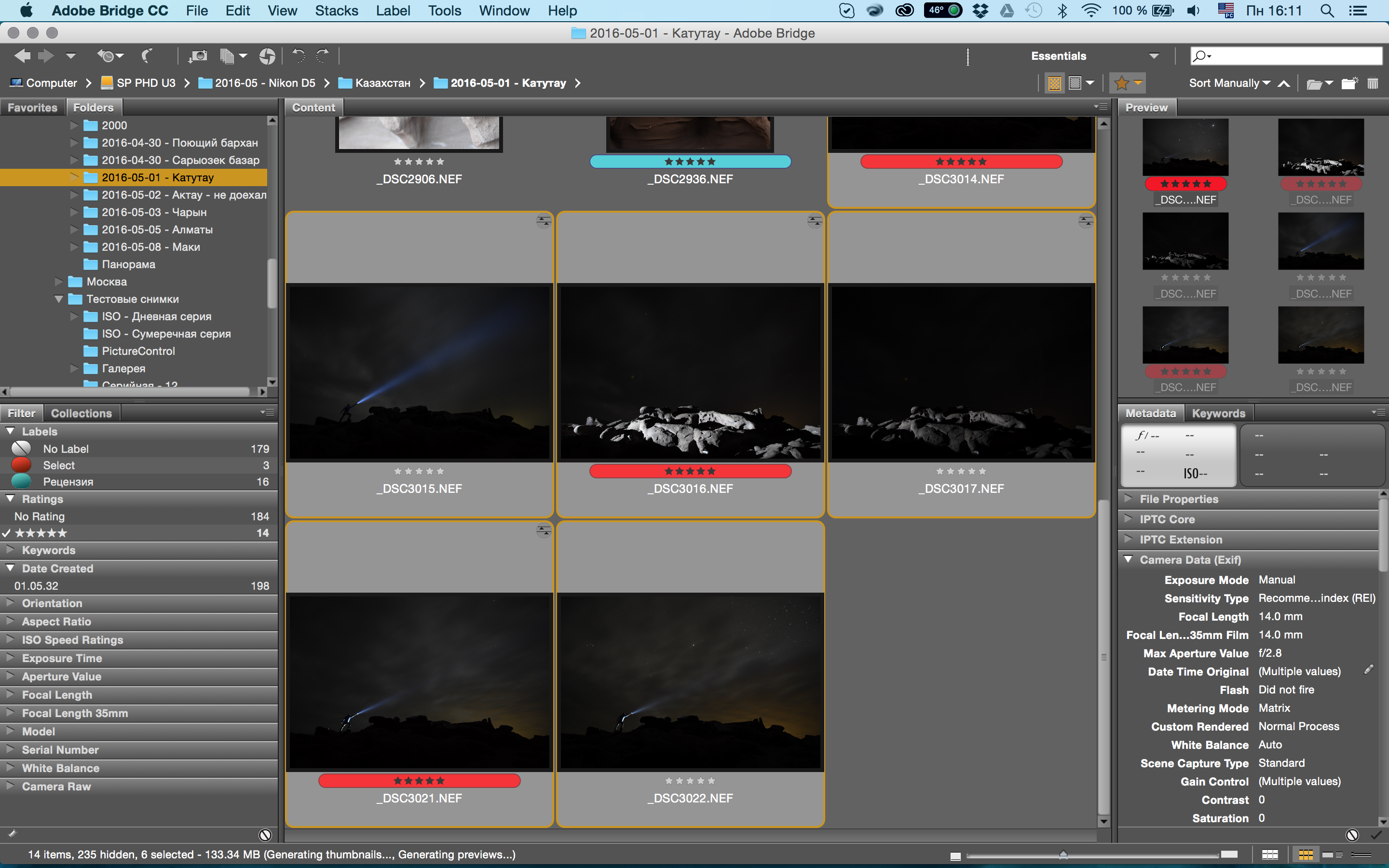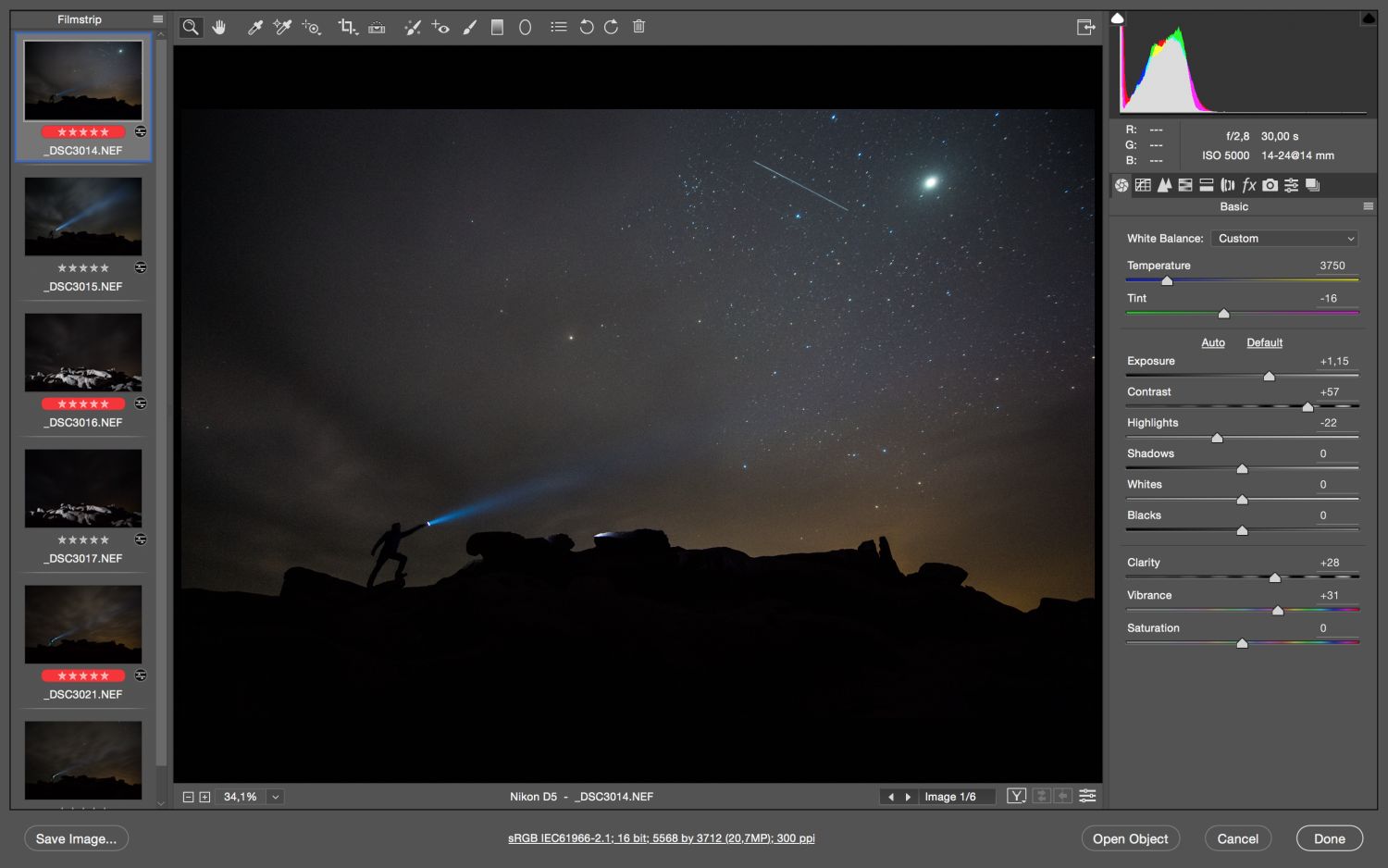 Мой любимый объектив для такой съемки - AF-S Nikkor 14-24 f/2.8. На максимально открытой диафрагме этот объектив дает очень высокое качество картинки. Выдержка, которую вы будете использовать для съемки, зависит от того, какой результат вы хотите получить, а именно хотите ли вы увидеть на фотографии статичные звезды, или звезды, размазавшиеся в треки. Второй вариант требует длинных выдержек - от десятка минут до нескольких часов. Съемка и обработка треков звезд - особая история, которой можно посвятить отдельный материал. А в рамках нашей фотошколы мы поговорим о том, как получить точечные звезды.