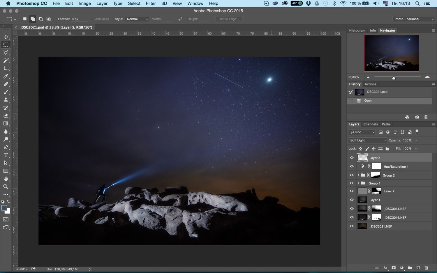 Съемка любой ночной фотографии - долгий и кропотливый труд, который начинается еще до того, как вы установили штатив и выставили ракурс. Эта фотография - не исключение. Все началось с идеи, а продолжилось многочасовой съемкой, во время которой было сделано несколько десятков дублей. Эта фотография составлена из нескольких, снятых с одинаковыми параметрами. На одной получилось хорошо подсветить фигуру человека, на другой - скалы, на третьей удачно вышли звезды, а четвертая оказалась идеальной базой, чтобы собрать все остальные