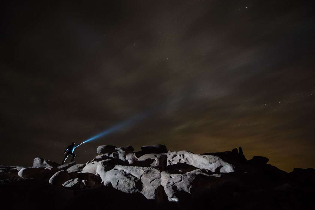 Мне очень хотелось, чтобы в кадре был герой, который не просто подчеркнет масштаб, но и внесет свой вклад в сюжет, поможет развить историю. Моим героем в этом кадре стал я сам. Когда я увидел, что небо начинают затягивать облака, то сразу понял, что я должен своим фонариком эти облака разгонять. Так я понял, в какой части кадра я должен стоять и куда светить. Благодаря режиму отложенного спуска с задержкой 20 секунд я смог нажать на спуск, добежать по скалам до нужной мне точки и начать позировать. Очень удобно, что камера Nikon D5 в режиме отложенного спуска может сделать не один, а сразу несколько кадров, до девяти. С каждым новым кадром я немного менял положение и направление фонарика, чтобы потом выбрать самый самую удачную комбинацию.