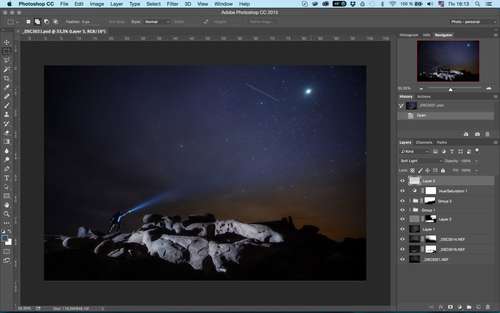 В результате этой съемки я получил серию фотографий - на одной удачно вышло небо, на другой фигура хорошо подсвечена вспышкой, на третьей интересно проработан передний план. Дальше все эти фотографии загружаются в Photoshop для монтажа. Если вы хотите избежать проблем с монтажом итоговой фотографии, постарайтесь во время съемок не двигать штатив. Малейшее смещение приведет к тому, то фотографии будут незначительно разнесены, и вы потом долго будете подгонять их одну к другой.