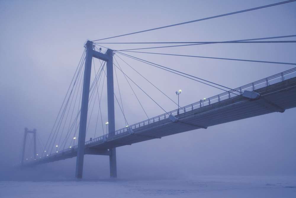 В туманное утро даже городской мост может стать романтиком… Упорядоченная геометрия элементов моста на фоне тумана великолепно передает как линейную, так и тональную перспективу.