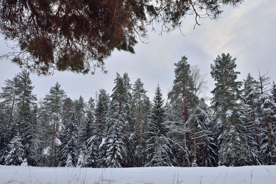 Пасмурная погода превращает любой снимок лесного ландшафта средней полосы России в монохромный, почти черно-белый кадр. И только очень редко ветер разрывает низкие облака, показывая серо-голубое небо. Снимать будем широкоугольным объективом, в качестве переднего плана возьмем ветку сосны, она уравновесит нам дальний план леса. Попробуем средствами камеры усилить насыщенность и проявить хотя бы цвет или фактуру неба.