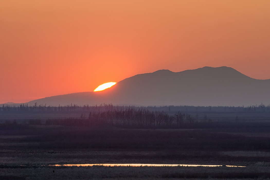 Рассказ о работе сотрудников заповедника, который был опубликован на нескольких профильных сайтах и в дальневосточной прессе, я закончил простым пейзажным кадром, снятым при помощи телеобъектива. После того, как на следующий день пожар был потушен, мгла рассеялась, я с удивлением увидел, что заповедник окружают горы. Раньше из-за дыма я не мог их наблюдать. Пришлось сильно диафрагмировать телеобъектив, потому что в условиях равнины получить относительно резкое изображение гор, диска солнца и лесных урочищ иначе было бы невозможно.