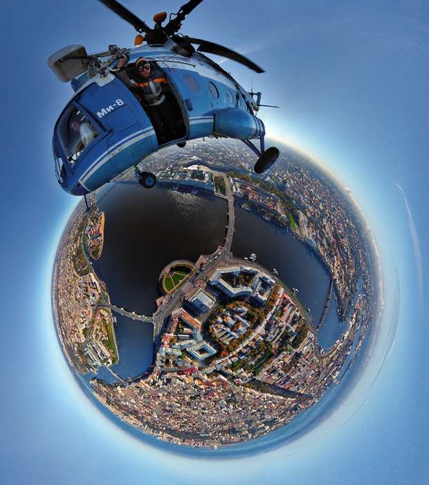 Когда-то давно, примерно в 2006 году, мы научились снимать сферы на земле. Тогда это было еще в диковинку и являлось занятием для продвинутых энтузиастов фотографии. Требовались штатив, специальная панорамная головка, достаточно глубокие знания при съемке и склейке сферы. Со временем технология упрощалась, развивалась и становилась все более доступной. К тому времени мы имели довольно большой опыт в фотосъемке с вертолетов и самолетов, и однажды у нас появилась идея: а почему бы не нарушить все существующие классические законы съемки сфер и не попытаться сделать это в воздухе? И мы придумали, как снять сферу в небе, где нельзя поставить штатив и высокоточную панорамную головку, а вертолет из-за ветра сносит на десятки метров при съемке.