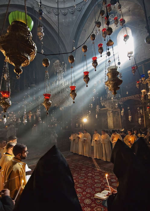 Божественный свет льется сквозь осязаемую атмосферу, наполненную сладким дымом благовоний, играет в стеклянных чашечках лампад, превращая их в гирлянду новогодних лампочек. Из-за интенсивного светорассеяния пучок лучей света сам по себе стал чем-то вроде огромной люминесцентной лампы, то есть источником рассеянного света. Обычно в церквях интервал яркостей очень большой. На фотографиях свечки в руках прихожан становятся похожими на блуждающие огоньки, лишенные опоры. Экспонирование по светам приводит к провалам в тенях. Но в данном случае светорассеяние позволило ровно высветить все уголки храма. Свечки в руках монахов притягивают взгляд к белым одеждам.