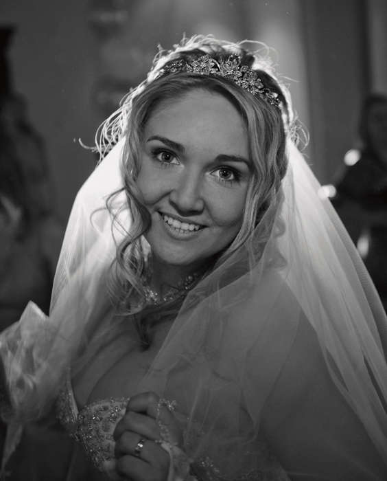 Без такого набора приспособлений при съемке вертикально ориентированной камерой любая вспышка — и встроенная, и накамерная — оказывается сбоку от объектива. В результате возникает черная тень или справа, или слева вдоль вертикалей в кадре. Они наверняка убили бы этот сюжет, но моя вспышка всегда над объективом. Ее рассеянный свет нарисовал тени в привычных местах: под подбородком, под носом, под локтями, под складками платья. Минусовая экспокоррекция и съемка в формате RAW избавили картинку от пересветов на лице невесты и на платье.