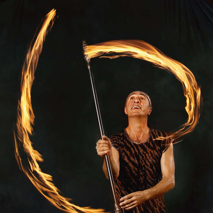 Я решил сделать картинку, которая была бы похожа на то, что я видел глазами, то есть огненный круг в руках артиста, вращающего черную металлическую трость. В лоб задачка не решается, потому что включение вспышки в автоматический режим синхронизации по передней шторке привела бы к заморозке движений фигуры артиста, но его руки, трость и факелы были бы слегка размазаны. Мне же хотелось, чтобы сам жонглер и его трость были резкими, а факелы оставили длинные хвосты.