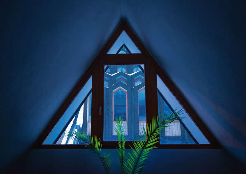 В этом кадре синий треугольник оконного проема сталкивается с зеленым светящимся цветком.