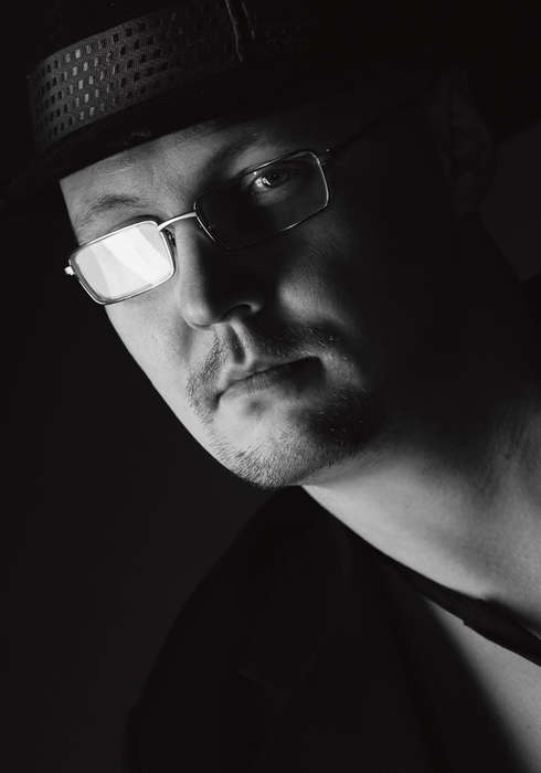 Темная тональность портрета подразумевает наличие в снимке большой площади, заполненной темными пикселями, на фоне которых светлые горят особенно ярко. Однако выделение главного основано не только на этом контрасте. Бликующее стекло очков и левый глаз неспроста оказались в зоне третей, а голова и шея героя вытянуты вдоль нисходящей диагонали.