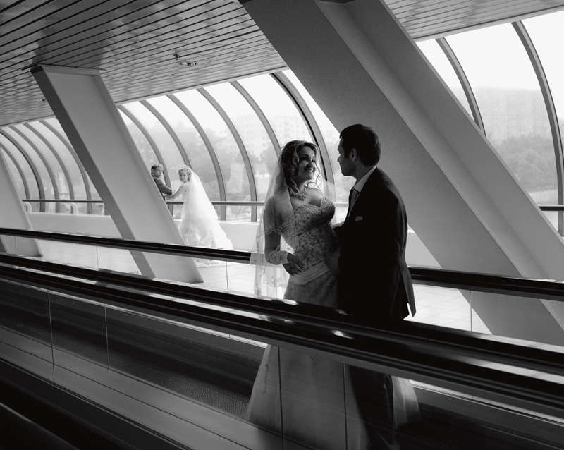 Я немножко поснимал их в аэропорту, пока ждали регистрации. Условия для съемки были сложными: свет в зале ровный, рассеянный, по спектру зеленый от люминесцентных ламп. Я вынужден был воспользоваться помощью ассистента, который подсветил молодых фонарем с галогеновой лампой. Контраст цветовых температур — теплой галогенки и холодных источников — позволил получить теплый цветовой и в то же время яркостный акцент в середине кадра. Выделение главного и в этом случае не обходится без применения сразу трех инструментов.
