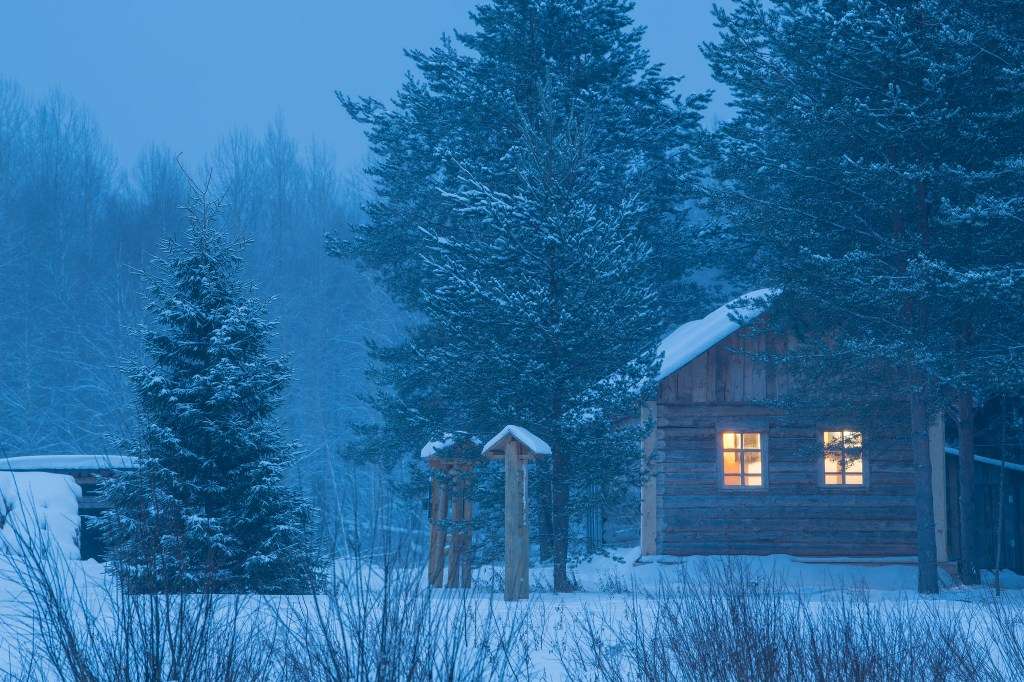 Обязательно постарайтесь поснимать в синий час - это время после захода солнца, когда пейзаж в кадре приобретает голубой оттенок. Особенно эффектно такие пейзажи смотрятся с одиноко стоящей избушкой, в окошке которой горит свет. Контраст общего синего тона кадра и теплого света из окна создаст ощущение уюта.