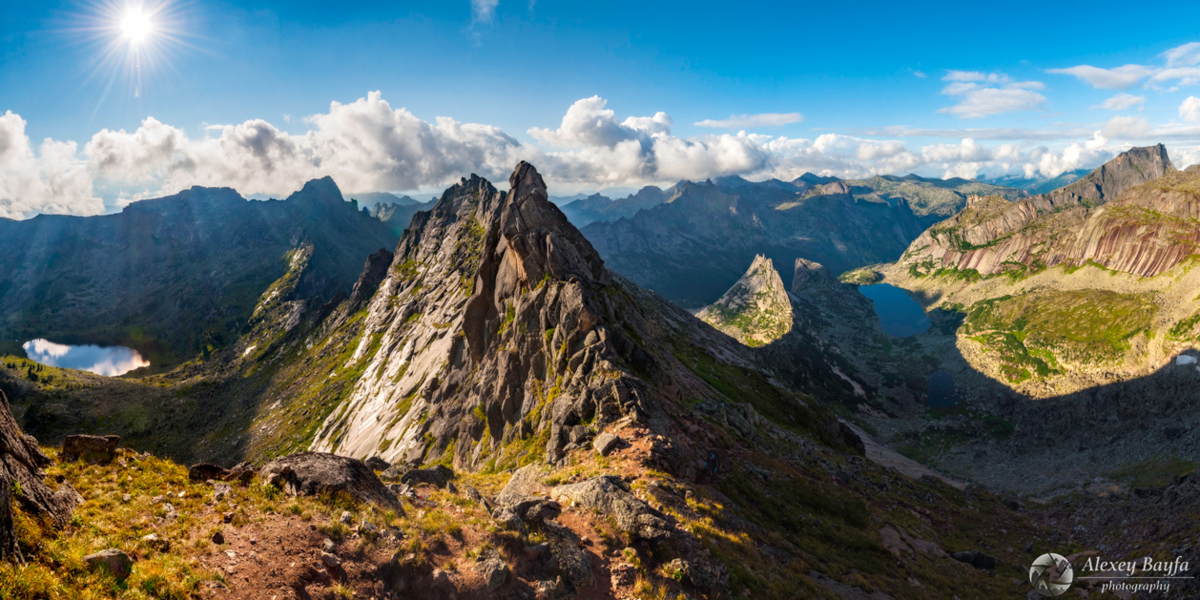 Однорядная панорама из пяти вертикальных кадров, градиентный фильтр блокирует верхнюю часть кадра при съемке против солнца.