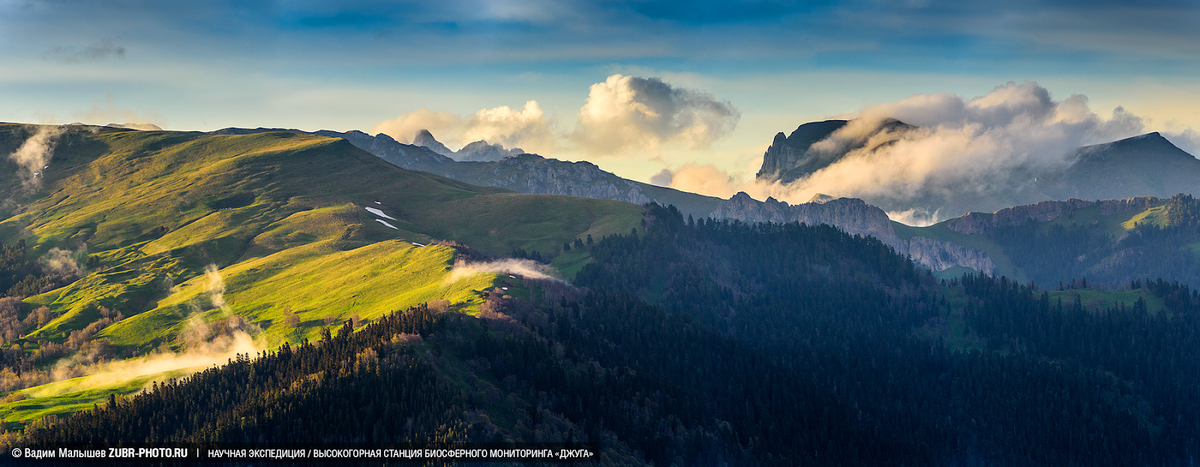 Однорядная панорама из пяти вертикальных кадров, съемка проводилась с рук. В качестве ориентиров для перекрывающихся частей кадра хорошо подходят стволы пихт.