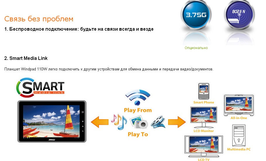 • Эксклюзивная функция Smart Media Link позволяет легко подключиться к другим устройствам для обмена данными и передачи видео/документов
