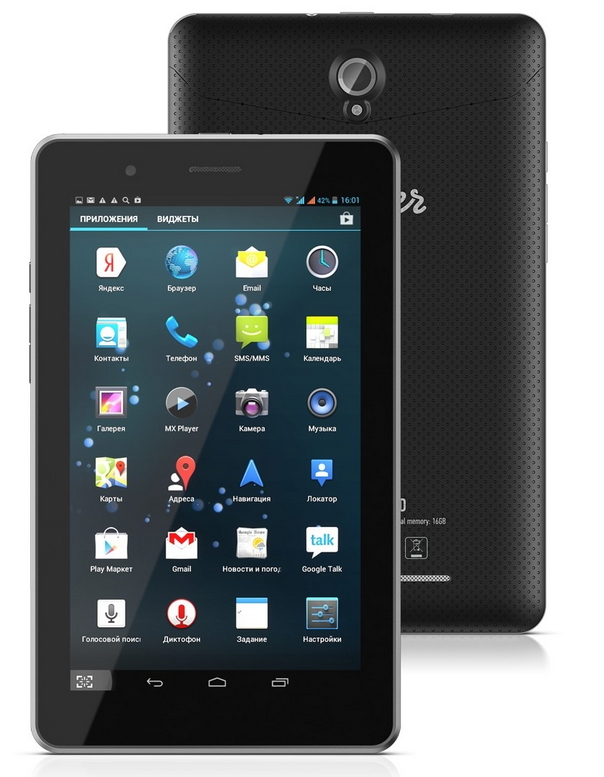 Размер дисплея, дюймы - 7, Операционная система - Android, Версия ОС - 4.1 (Jelly Bean), Процессор - ARM Cortex A9, Частота процессора, МГц - 1500, Количество ядер - 2, Оперативная память, Гб - 1, Тип оперативной памяти - DDR3, Встроенная память, Гб - 8, Поддержка карт памяти - microSDHC, Емкость карты памяти, Гб - 32, 3G, Wi-Fi, Bluetooth, Функция GPS, Камера - фронтальная, Автоматическая ориентация экрана, Время работы видео, час - 5, Датчики - акселерометр, датчик освещенности, компас, Дополнительные возможности планшета - тыловая камера с функцией распознавания лиц; Предустановленные программы: Яндекс сервисы, Evernote, CoolReader, Ebook Droid, GisMeteo, Navitel (try&buy), Wexler.Play., В x Ш x Г (мм) - 128 x 198 x 11, Вес - 0.39