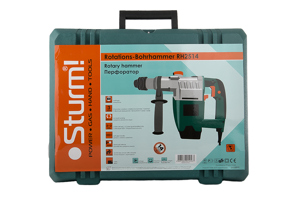 Мощность, Вт - 1850, Тип питания - сеть 220 V, Тип крепления бура - SDS-Plus, Режимы работы - долбление, сверление, сверление с ударом, Реверс, Антивибрационная система, Max число оборотов холостого хода, об/мин - 800, Max количество ударов в минуту, уд/мин - 3200, Max энергия удара, Дж - 5.5, Max диаметр сверления (бетон), мм - 36, Основной цвет - синий, Вес - 5.3Перфоратор Sturm! RH 2518