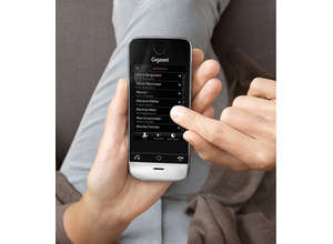 Домашний телефон Gigaset: мальчик с пальчиком листает cенсорный экран